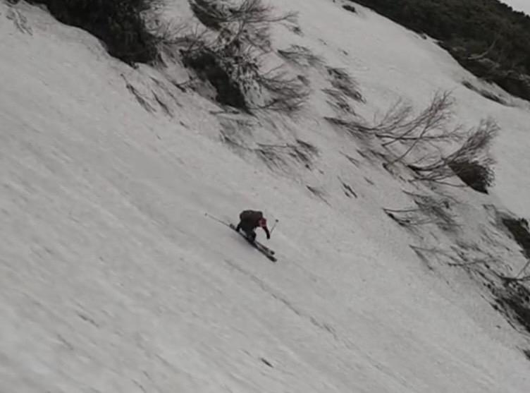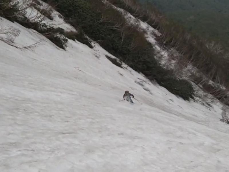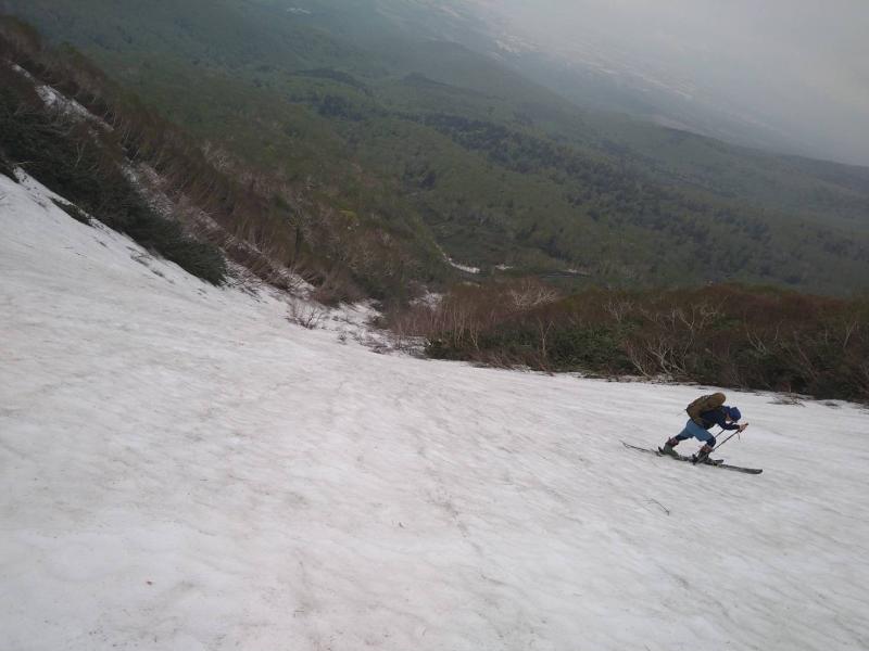しかし、上部の雪がなくなった辺りの藪が思った以上に濃く、登山道までの距離100m以上をスキー板を持って抜けるのは厳しいと判断し、ここでドロップ。