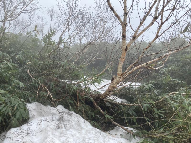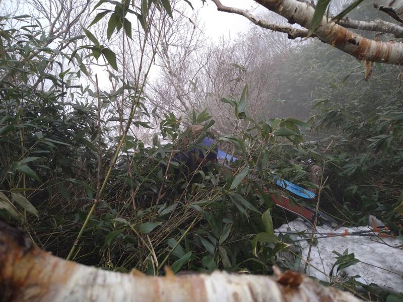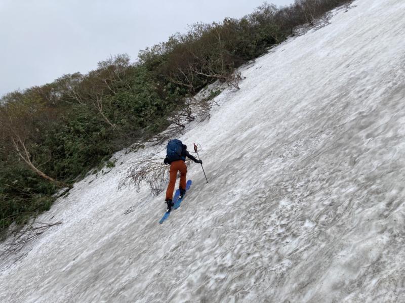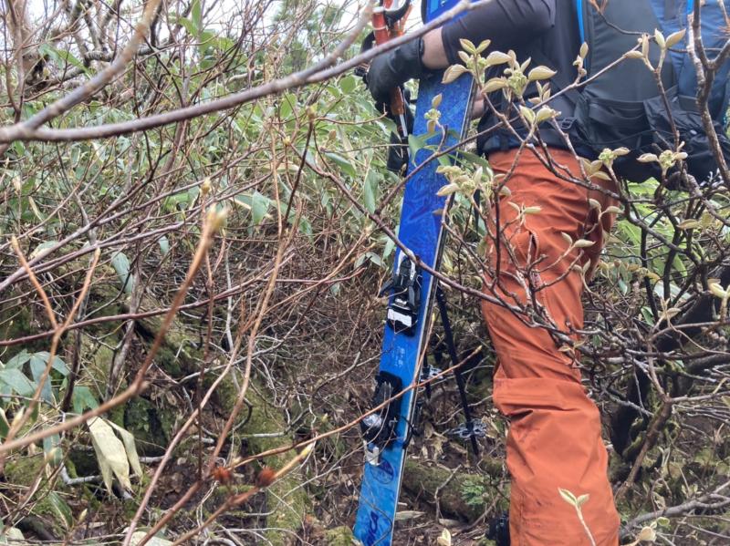 上部の藪漕ぎはスキーを持って進むのは困難で、足元に雪が残っている箇所もあるが、安易に乗ると踏み抜いてしまい危険。