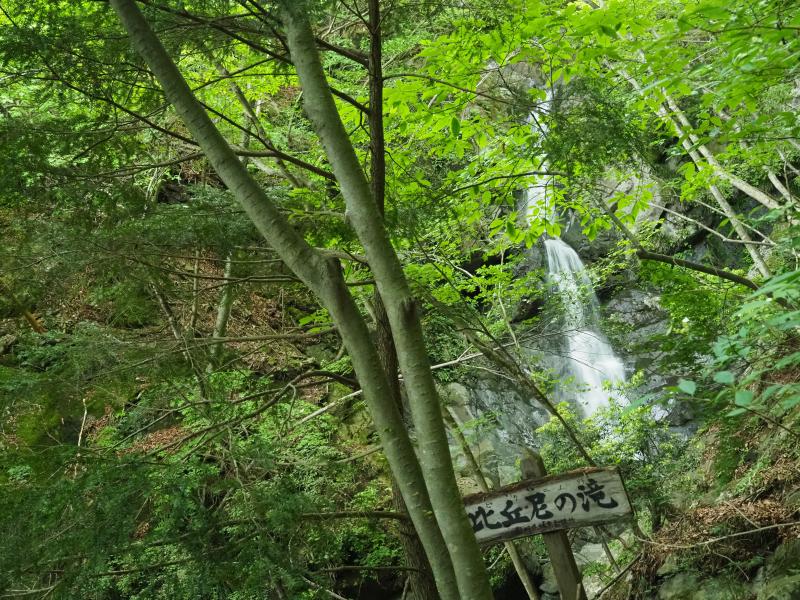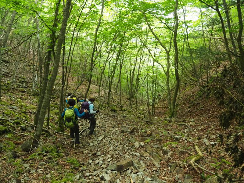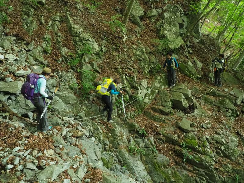 最初はザレた滑りやすい九十九折の登山道。落石しないよう注意して腿筋を踏ん張って下ります。やがて何度かの渡渉やロープが設置された急な場所、道幅の狭い急な斜面。女子チームは結構ヘロヘロ。最後に比丘尼の滝にご褒美をいただき今日の登山は終了!