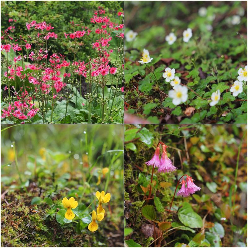 左上:クリンソウ、左下:キバナノコマノツメ、右上:シロバナノヘビイチゴ、右下:コイワカガミ