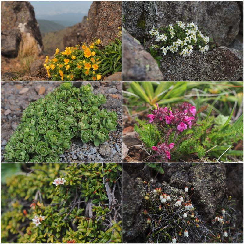 上左:ミヤマキンバイ、上右:クモマナズナ、中左:イワベンケイ、中右:タカネシオガマ、下左:ミネズオウ、下右:イワヒゲ