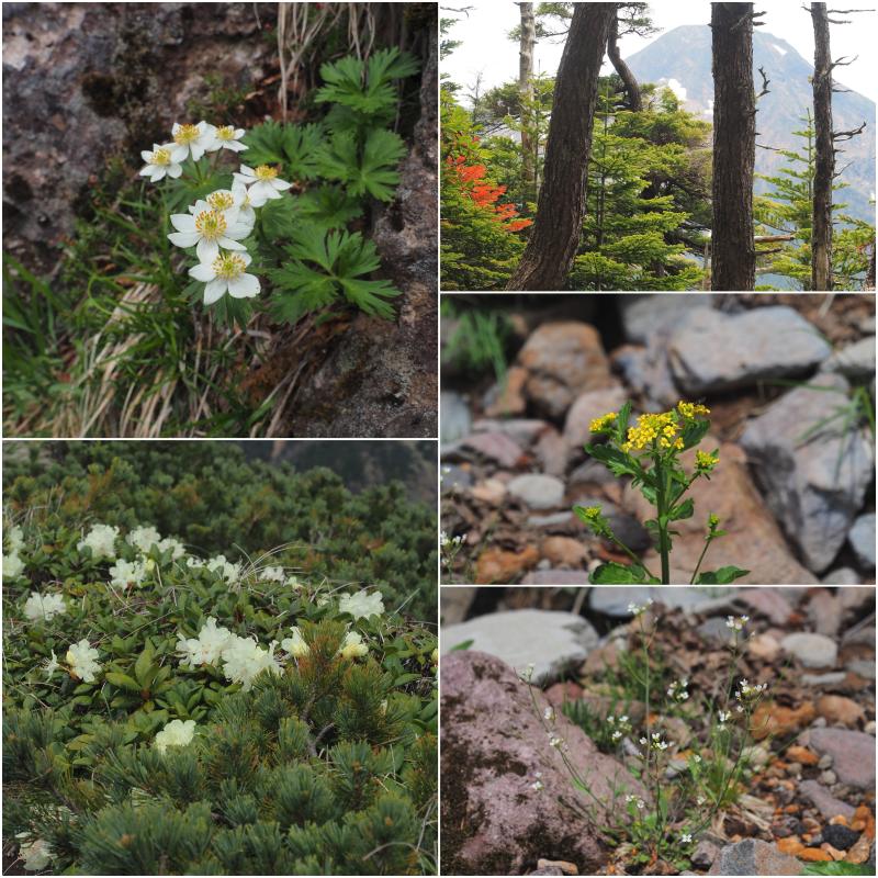 左上:ハクサンイチゲ、左下:キバナシャクナゲ、右上:ヤマツツジ、右中:ヤマガラシ、右下:ヤツガタケナズナ