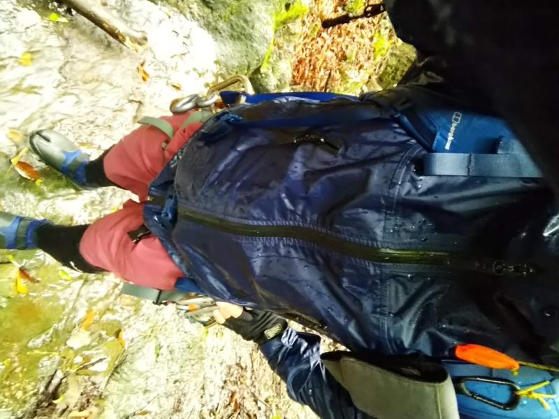 キャラバン 沢タビ、ファイントラック フラッドラッシュジップシャツ、タイツ、アクティブスキンT、アームカバー、ヘルメット、使い古しのレインジャケット、沢手袋、バックパック30㍑、SOTO アミカス、サーモライト、アライテント ビバークツェルト