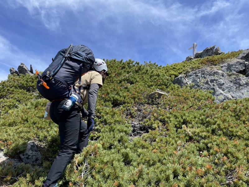 緊張の懸垂が終わって後は前穂を目指すのみ。1峰まで来ると前穂と奥穂の圧倒的な存在感をひしひしと感じ取れます。踏み跡を辿って安全な場所を歩いているつもりが、いつの間にかロストして、際どい岩の上を歩いてたりハイマツの海にはまったり。ルートミスしたら先頭交代という暗黙のルールに乗っ取り、ゲーム感覚で楽しみながらルーファイしました。