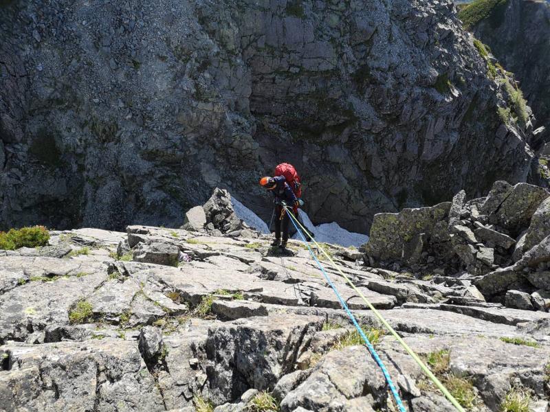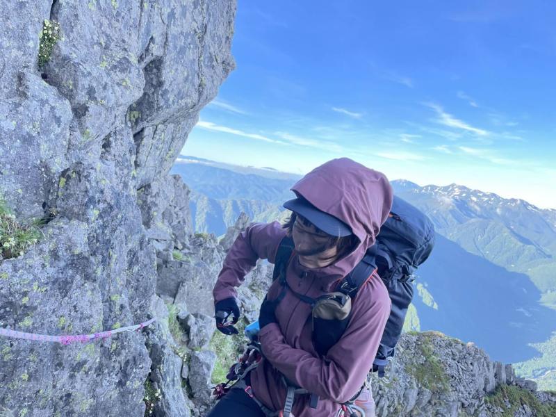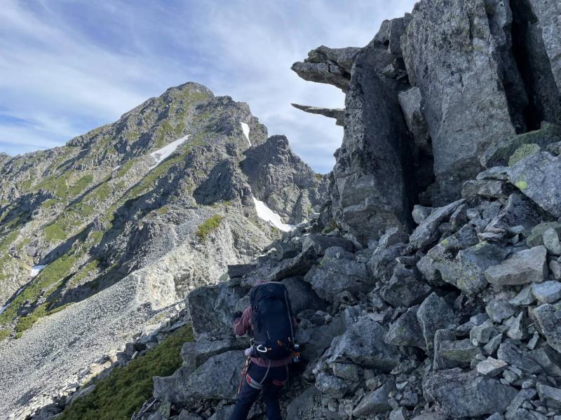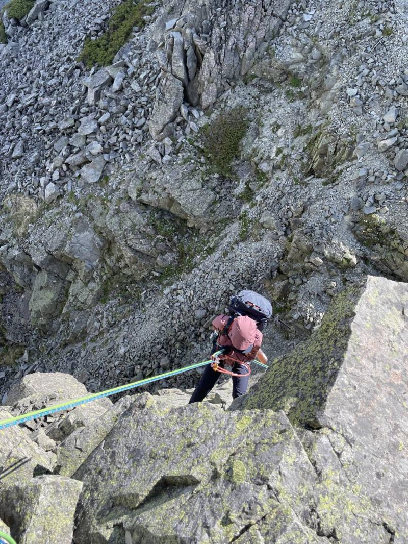 2日目のハイライトは懸垂下降とルートファインディング。登攀はありませんが、下降点の状況や強風の影響など、問題なく抜けられるか行ってみないとわからず、ちょっとしたバリエーション要素を味わえます。3峰まではスムーズに越えて、いよいよ2峰の懸垂点までやって来ました。