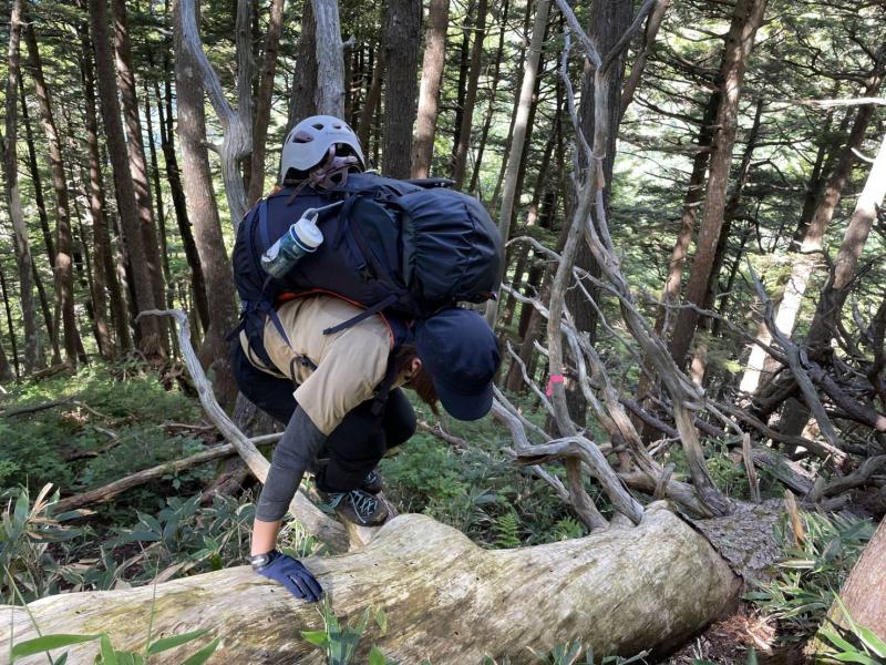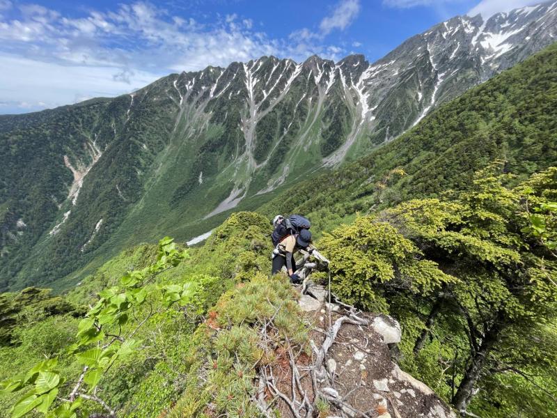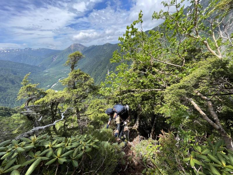 標高差は1000m以上、代り映えのしない樹林帯を黙々と登っていると、木々の間からゴツゴツした西穂、奥穂の稜線が見え隠れして、ここが北アルプスだということをしばらくぶりに実感できます。森林限界近くのアスレチックな岩場を登っては下り、さらにダケカンバの森を抜けるとようやく稜線に出ました。ちょっぴり強めの風でクールダウン、遥か下の河童橋を俯瞰しながら大休止の後、寝床を求めて再び重い荷を背負いました。