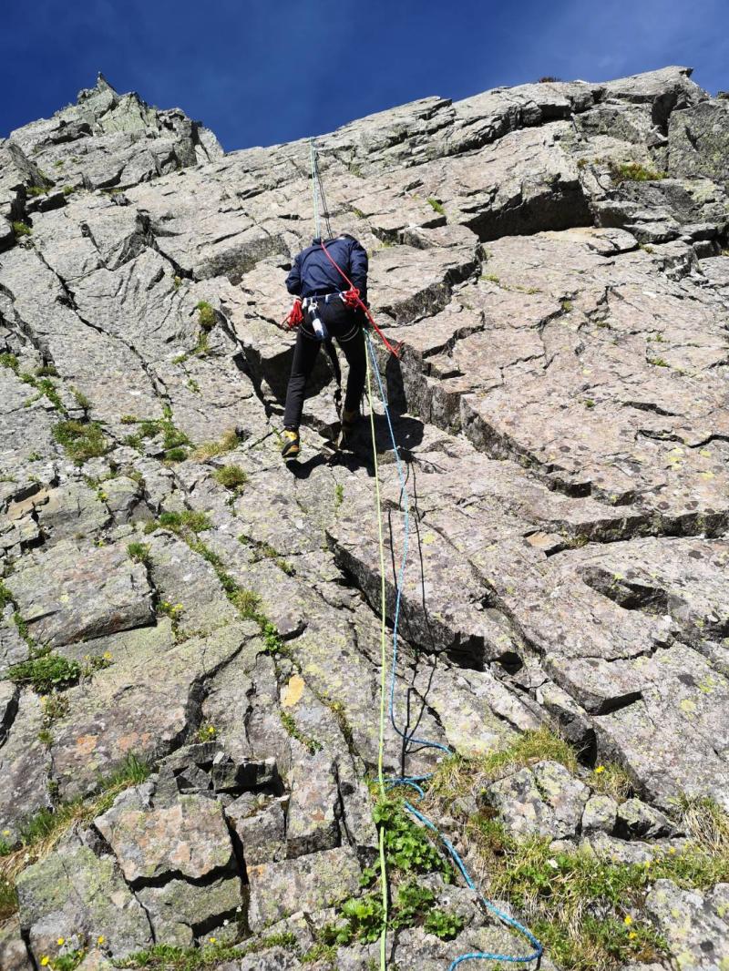 荷物を分散させるために今回はダブルロープ30mをそれぞれ1本ずつ持参しましたが、それが仇となってしまうとはつゆ知らず。緩いフェースで引っかかりそうな溝もなく、引きもきちんと確認したつもりが見事に回収不能に。滅多に使用することはないと思っていた登り返しを、早くも実践で使うことになってしまいました。身につけておいて本当に良かったです。