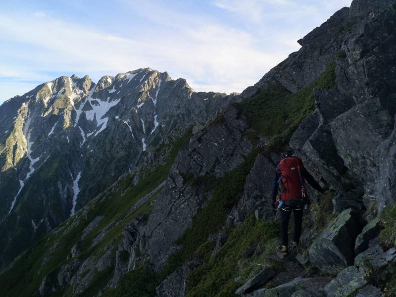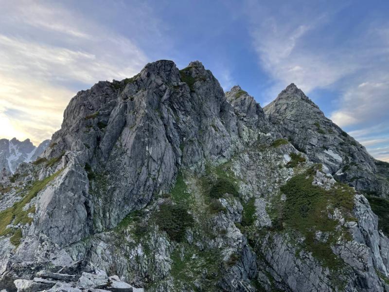 明神岳主稜は5つの峰が連なり、最初のピークの5峰にはシンボリックな木のピッケルが刺さっています。ここから眺める稜線は圧巻で、ギザギザの鋭峰を見たらあんなとんがりを登れるのかと不安になるほど。進めば進むほど足元は狭く不安定になってきたので、3峰手前の適当な場所でビバークすることにしました。