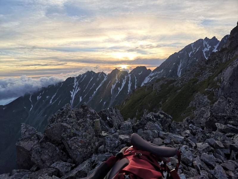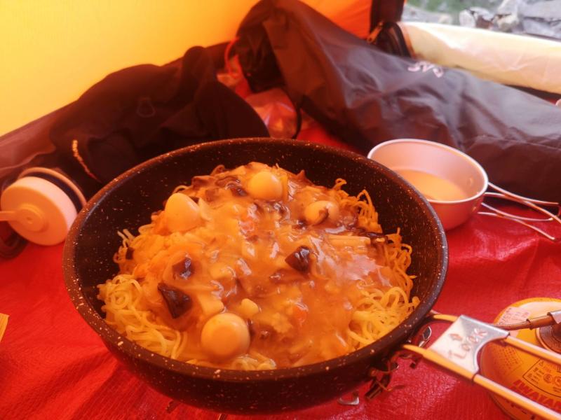 前室を開けるとそこは非日常の世界。ちょうど目の前に明神が拝める絶好の場所に張りました。左手には乗鞍や御嶽、右に目をやると常念山脈。なだらかな蝶ヶ岳の稜線にたゆたう雲の影を眺めていたら、いつの間にかうとうと。気温も寒すぎず快適で、幸せに包まれながらぐっすりと眠りました。