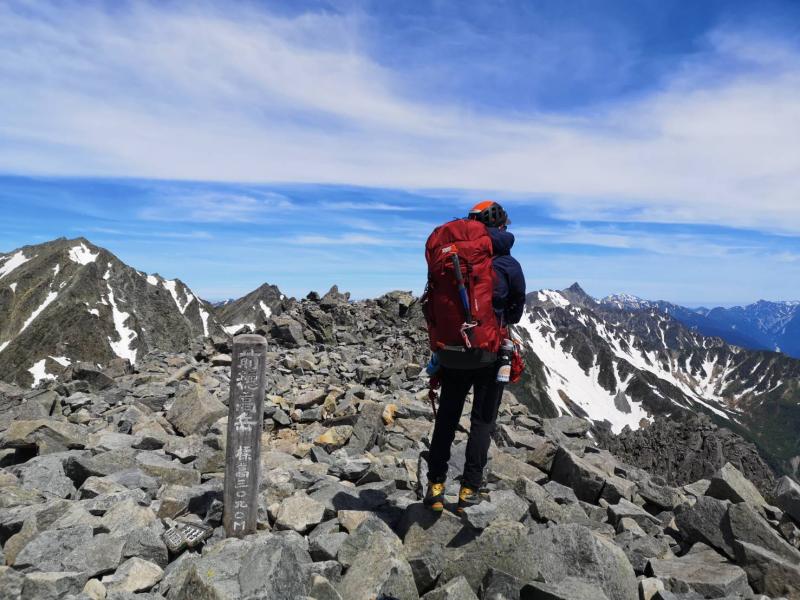 やっとこさ登山道に合流して前穂の頂上へ。ここまで来てようやく槍の穂先が顔を出しました。このエリアはかれこれ10年振りの再訪。10年前は岩にビビりながらよちよち歩いていたなぁ。初々しい頃の思い出に浸りながら灼熱の重太郎新道を下りました。