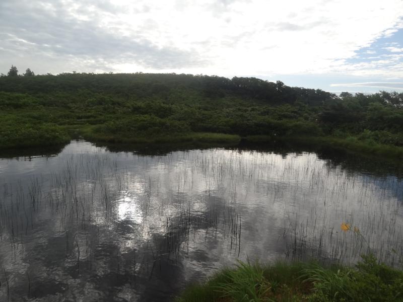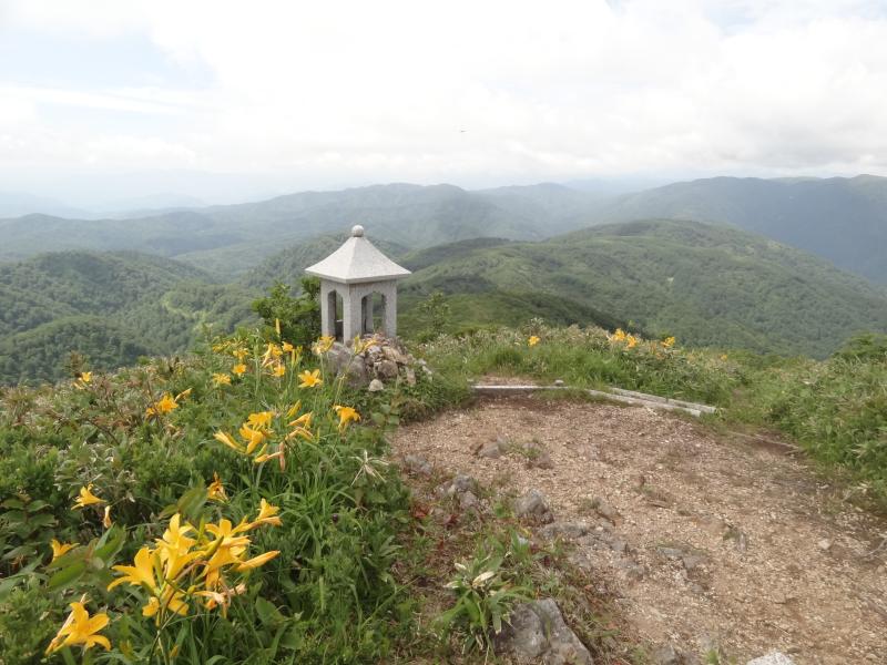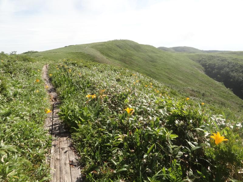 しだいに汗が滴りだした頃、ぱっと視界が開け、白木峰手前の太子堂が見えるとやや涼しい風が吹き出しました。そして太子堂手前からはニッコウキスゲ群生が見られるようになり、ここからがこの山のハイライト。特に白木峰手前のなだらかな草原に青空を背景にしたニッコウキスゲがマッチします。白木峰からはワタスゲ求めて、浮島まで木道ハイキング、途中の池塘も見逃せません。このあたりは桃源郷のような散策道で、快適でした。林道が開通していたら、ここまではすぐに来れますので、それは人気なのがわかります。平日ですが登って来る人は多く、岐阜県側の万波から来ている人もいました。