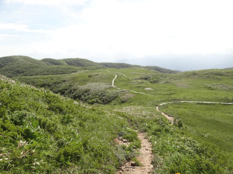 発電所からのコースは小白木峰経由で白木峰へは最も遠くなりますが、小白木峰にある池塘も通りますのでこの山域を全部、堪能できるコースですが、小白木峰まではひたすら尾根登りで長く感じます。また小白木峰からは広大な平原が続き、白木峰まではなかなか着かず、しかも粘土質の登山道でズルズルの所が見受けられ、歩きにくい感じです。