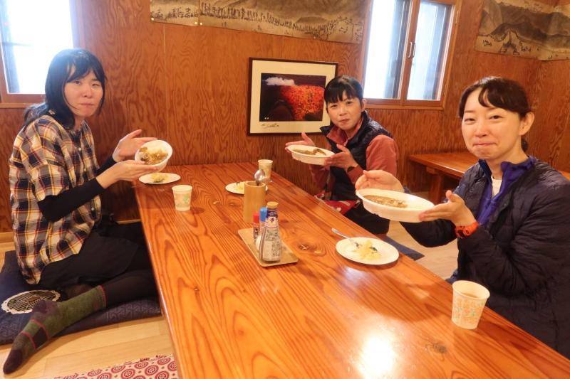 翌朝4時に起きてご来光を見に行くも、生憎の雲の中。気を取り直して小屋に戻り、朝食をいただくことに。味付け海苔や昆布、梅干しなど、ご飯のおかずがたくさんあったので白飯がどんどん進みました。