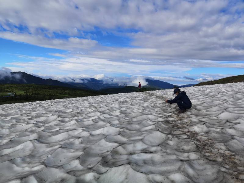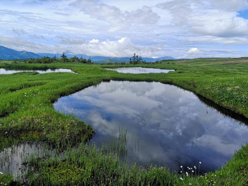朝ご飯後、外はみるみる晴れてきて青空が覗いてきました。これはチャンスと空身で湿原散策へ。優しく揺れるワタスゲや池塘に映る雲と青空が何とも素晴らしく、皆さん何度も写真を撮っていました。