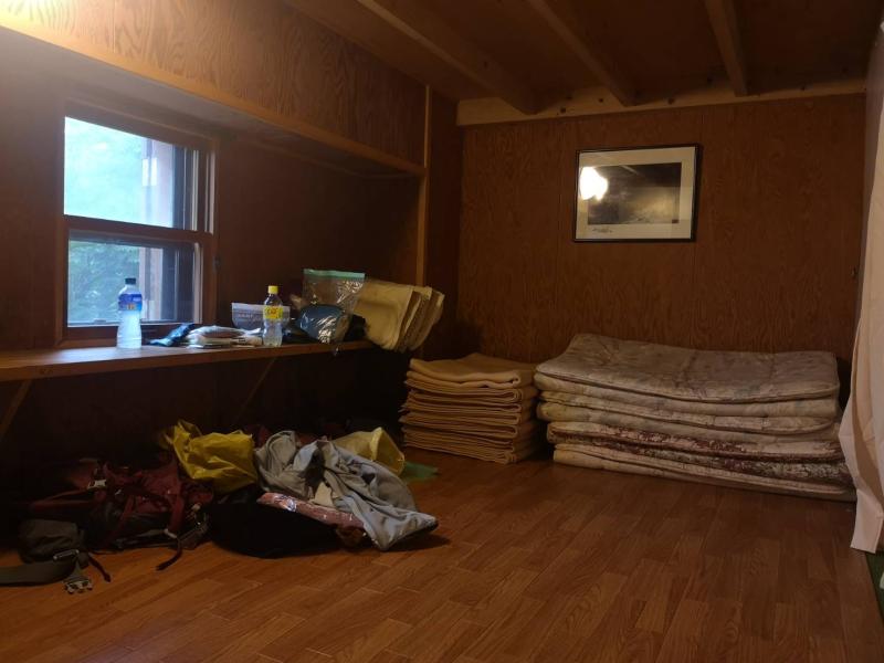 キャンセルが出たようで、小屋の中は広く使わせていただきました。夕食はたっぷりの甘口カレーとポテトサラダ。もちろんおかわり自由!たらふく食べたあとは、今時の山小屋泊の必需品・インナーシーツ最軽量選手権を急遽開催、様々なメーカー、様々な形を見る良い機会となりました。