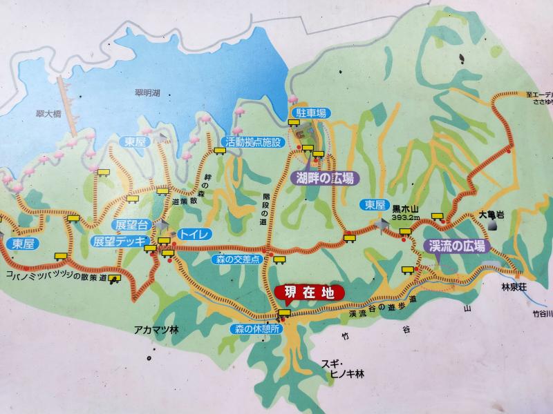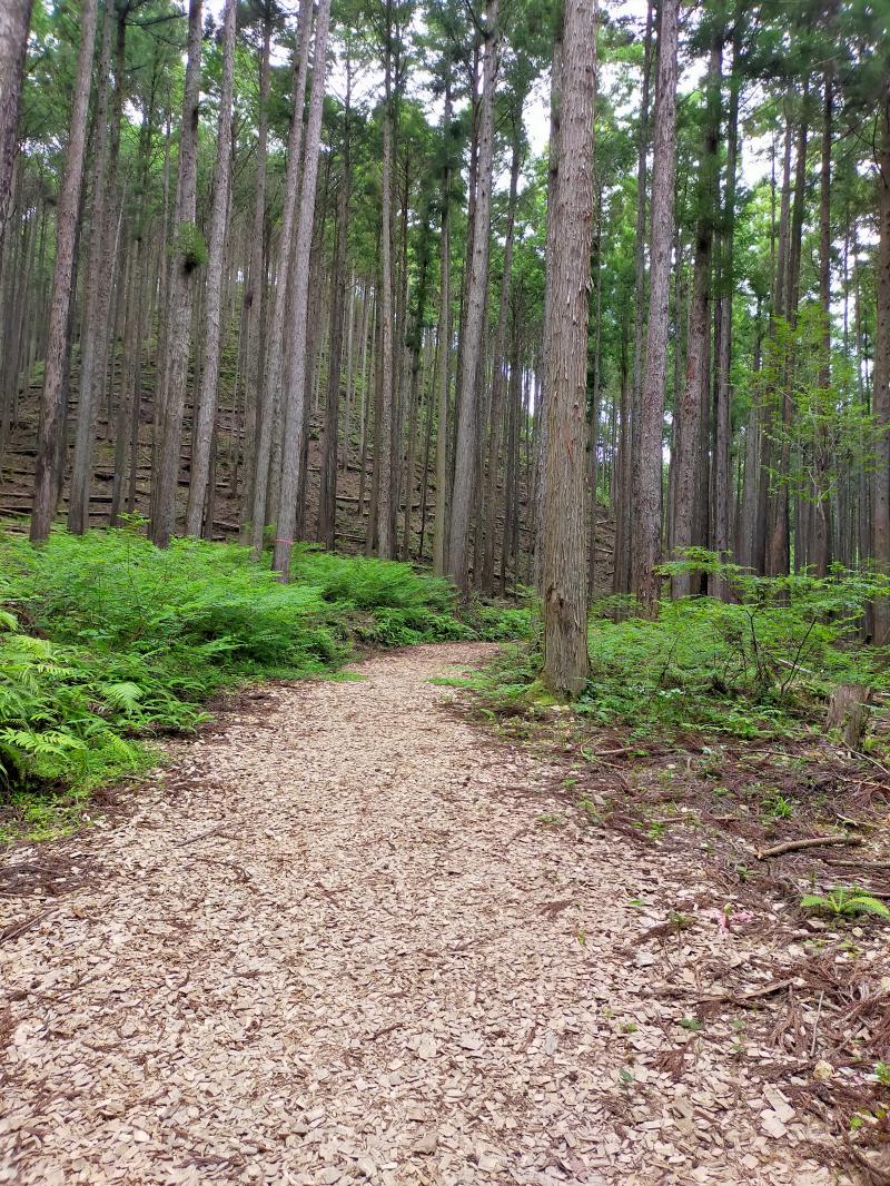 水遊び後に少し森林浴で歩きました。今回はつもりがなかったので、装備が不十分でしたが、道は歩きやすく整備してあるので、ローカットシューズで良さそうです。早くもヒグラシの鳴き声を聞き、涼しさ倍増でした。