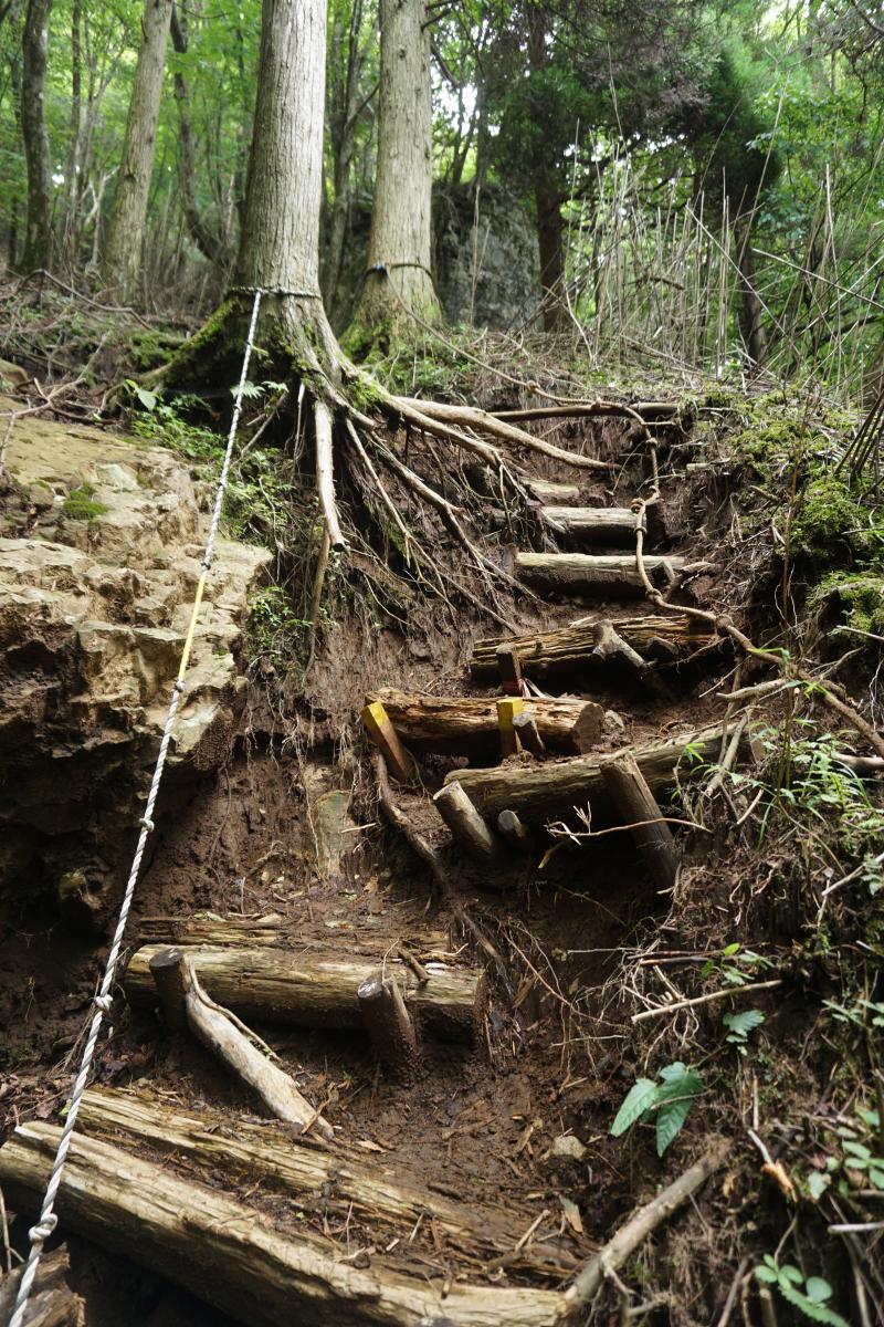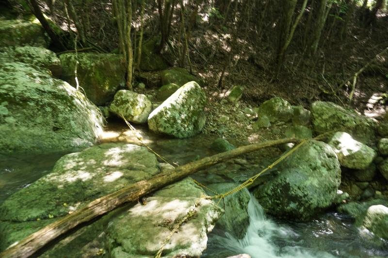 が、頂上で地元に方に話を伺うと、あれは手すりだったようで普段はそのまま渡れるが、水量が多い場合は靴を脱いで渡る等しているそうです。(木の上から落ちたら結構な落差があるので、くれぐれも気を付けて下さい。)