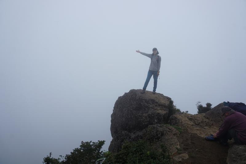 頂上手前の撮影スポットにもなっている大きな岩場では既にガスが出始めていたため、眺望ななし。