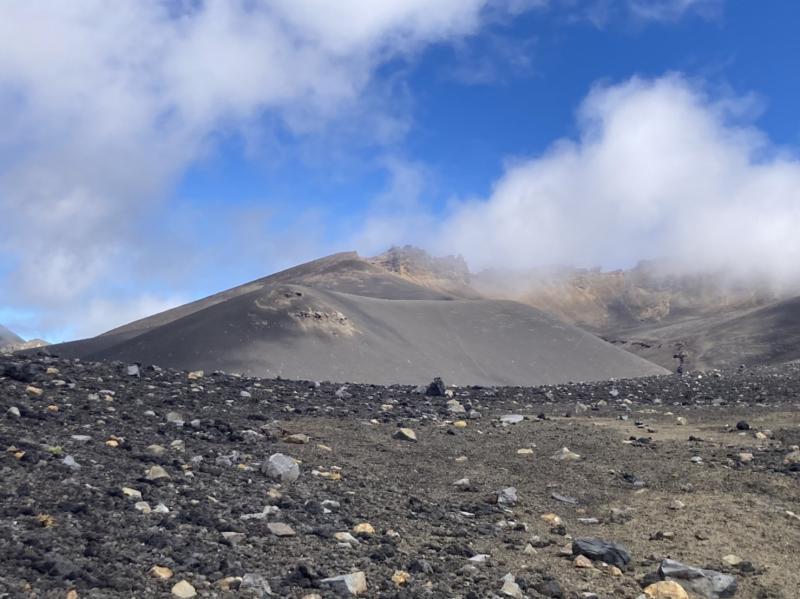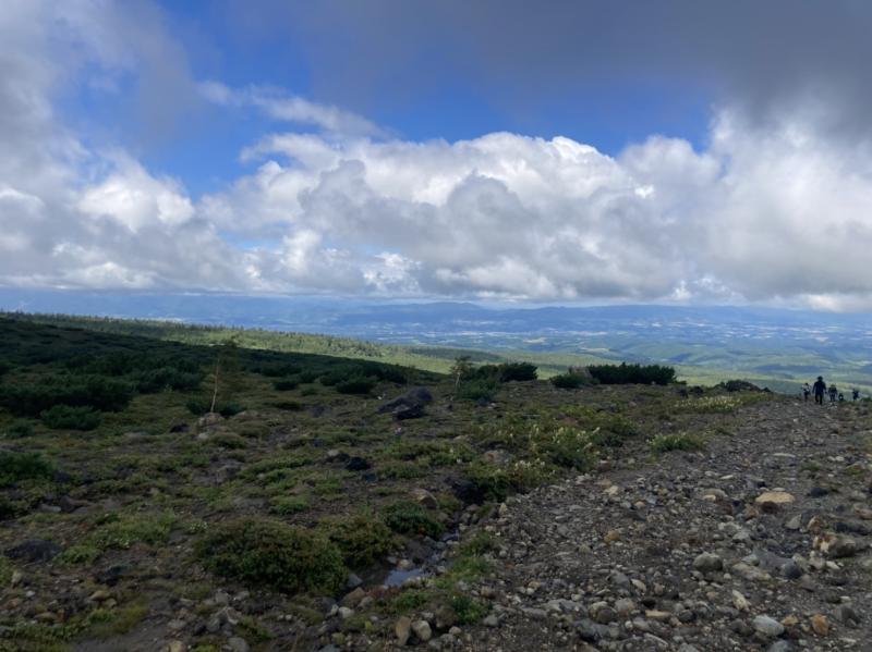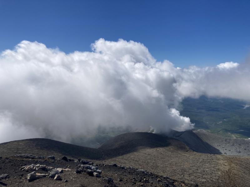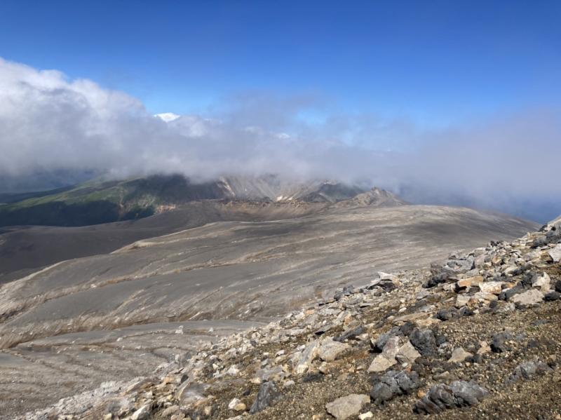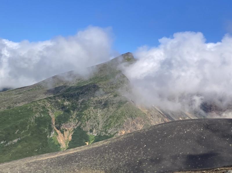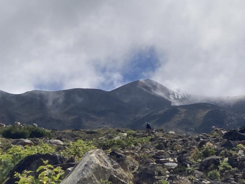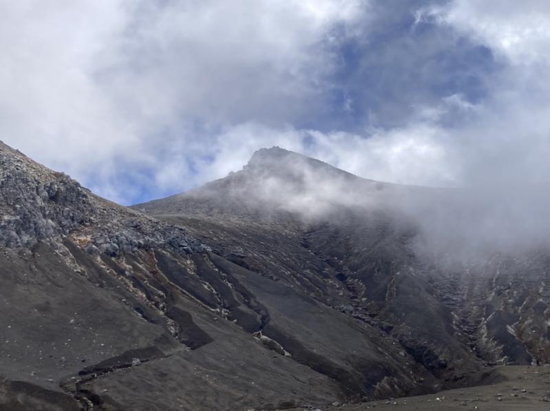一気に400m程登ると、今度は十勝岳のピーク付近が雲の切れ間から見えてきました。
