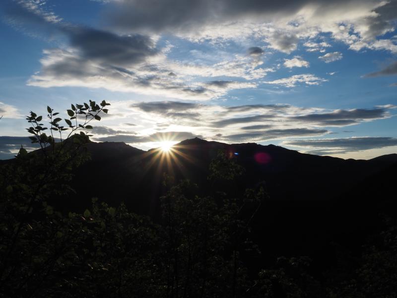草滑りを登り始めると、鳳凰三山の稜線から朝陽が登ってきました。