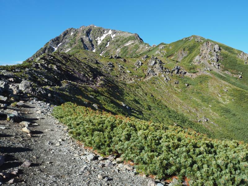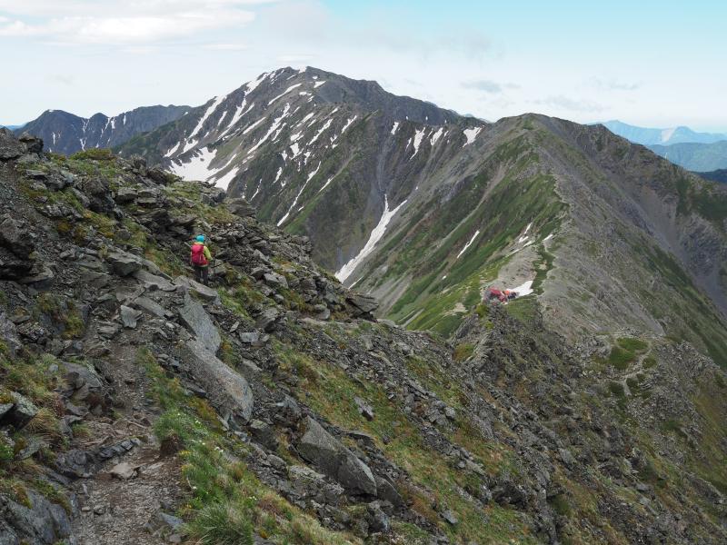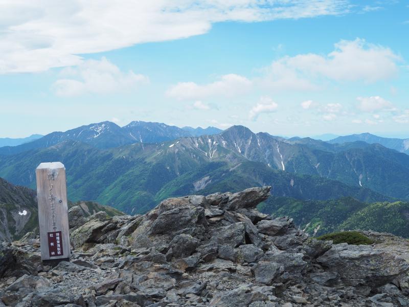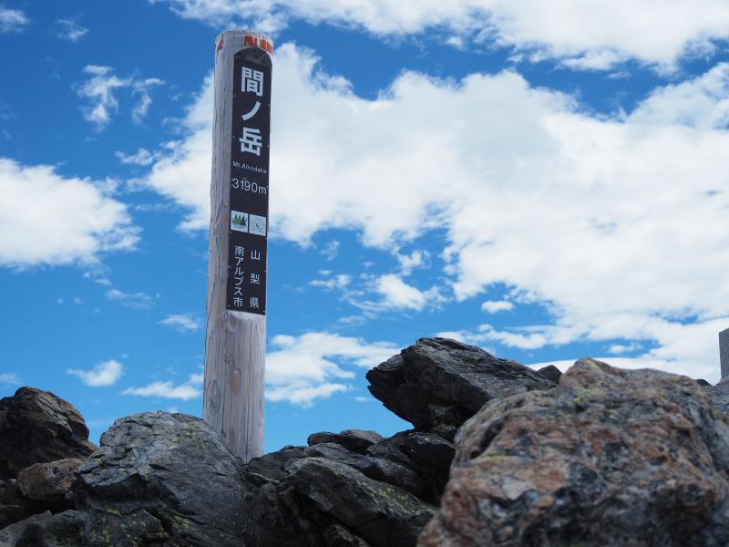 ここから間ノ岳へピストンです。とにかくずーーーと稜線歩きなので展望はとてもいいのですが風の影響をモロに受けます。今日は好天予報だったのに風が強い!!とにかく強い。苦行か?というほどの強風のなかひたすら黙々を歩を進め間ノ岳に到着!写真も撮っていられないほどの風が吹き荒れてました(苦笑)百名山に間ノ岳に行っておきたい、という妻のその望みオンリーで強風のなかここまで来ました、、、