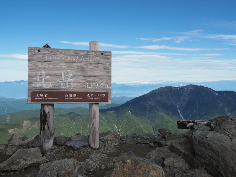 肩の小屋から15分強風の北岳に到着!お日様は雲に隠れていましたが山々ははっきりと見え、遠く富士山もバッチリでした!