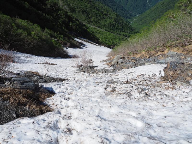 夏道でも急で階段やはしごの多い道ですが、今日はまだ残雪が残っていて軽アイゼンを付けての下山となりました。そして3回ほど沢筋をトラバース。そこがあまりステップが切られておらず、転倒したらそのままざーーーーっと流される危険あり。妻はビビッてとても慎重になり時間がかかってしまいました。