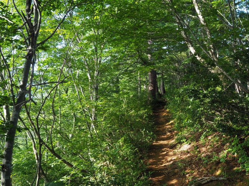 次第に道は狭まり木々に囲まれた登りをまたもや大汗をかきながら進むと次の水場、三沢清水へ。ここでもあたまから水をかぶる。今日もやたら暑いのだ。やがて頭上がひらけ古寺山。見えた山頂は!残念ながら小朝日岳で目的の大朝日岳はさらに奥に見える。遠い。でもいい眺め。