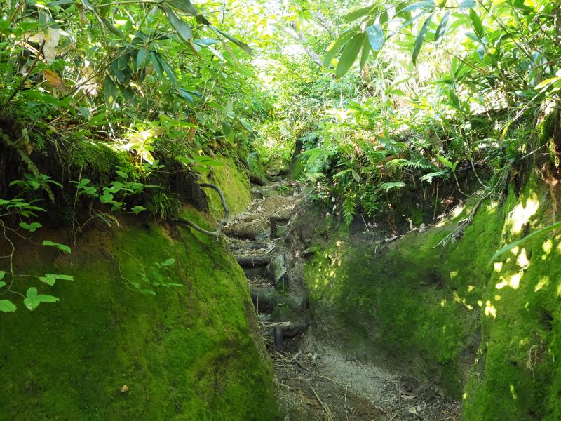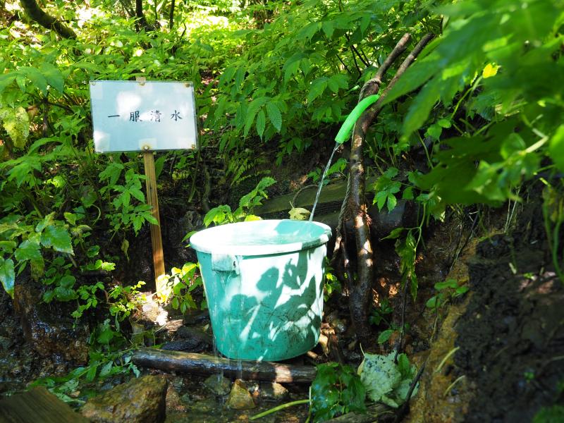 最初の一服清水までは森林の中の急な登りを進む。昨日と同様今日も暑いが比較的開放的な登山道なので多少風を感じる。カラダを慣らしながらも黙々と登り続け到着。一服清水の冷たい水で喉を潤し頭から水をかぶって火照ったカラダを冷やす。