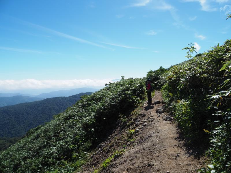 小朝日岳からの下りは片側が切れ落ちでいるので注意。樹林の中に入っても足場の悪い急な下りが続く。せっかく登ったのにまだ下るのか、、、というところまで下りた。登りに変わってしばらくすると稜線歩きが続く。台風の影響か今日はかなり風が強い。稜線に出て風の強さをもろに受ける。山肌の葉は風に吹かれ大きく揺れている。風の通り道がみえるくらいだ。