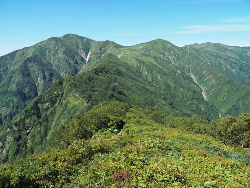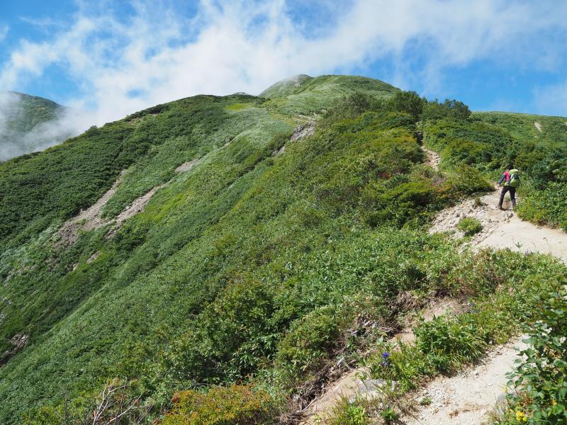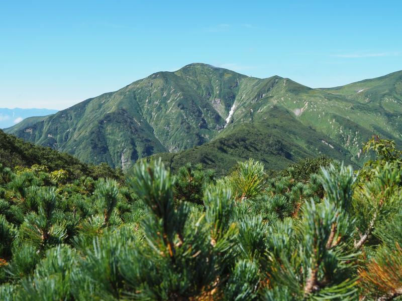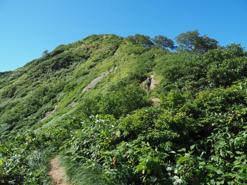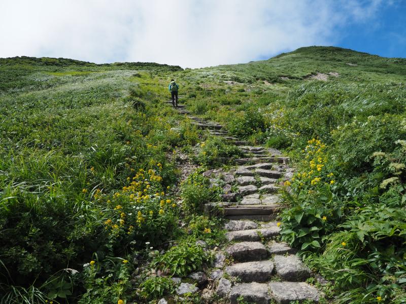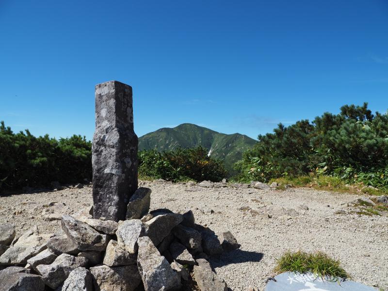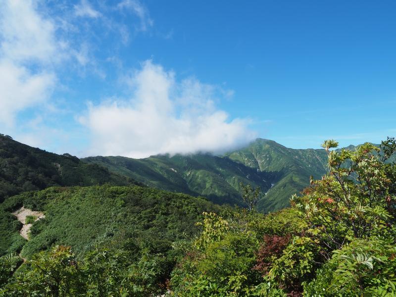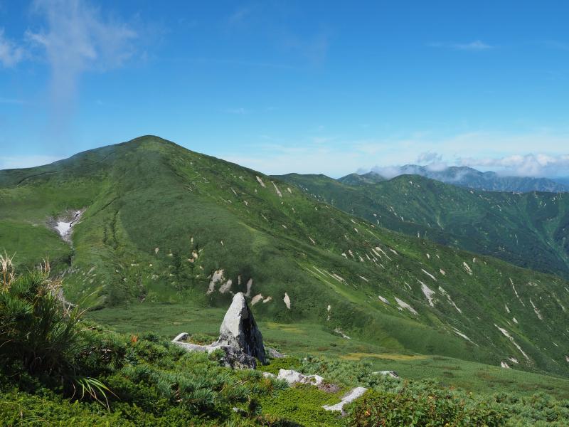小朝日岳には山頂を巻くトラバース道もあるがここはやはり山頂へ。下から見上げる登山道はかなり急な登り。ただひたすらと登り詰めると石柱のある広い場所にでる。しかとした表示はないが多分ここが小朝日岳。山頂からは素晴らしい朝日連峰の山々が望める。そしてこれから向かう登山道も。今日も果てしない道のりだ。