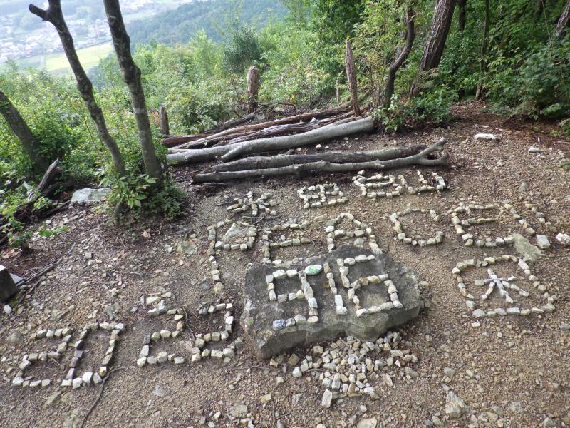 以前登った北側ではなく、今回は南側の牧野地区から登ります。こちらは2021年に白山神社コース、2022年に箱岩コースが開設された新しい登山道です。白山神社コースで登って行きますが、白山神社までは神社の参道で、その後は登山道になりますが、まだ丸太階段が目新しい。公園の散歩道のような北側の登山道と違い、こちらはやや傾斜が強い登山道でまっすぐ登っている感じです。稜線とは白山槍の手前で合流しますが、今日はタイタニック岩などには行かず、すぐさま左手に進み、頂上を目指します。山頂には今日も石文字の日付が設置されていて、頭が下がります。展望台まで行くと、東屋にウッドデッキも設置されていて、ますますいい感じの展望台に変わっていました。