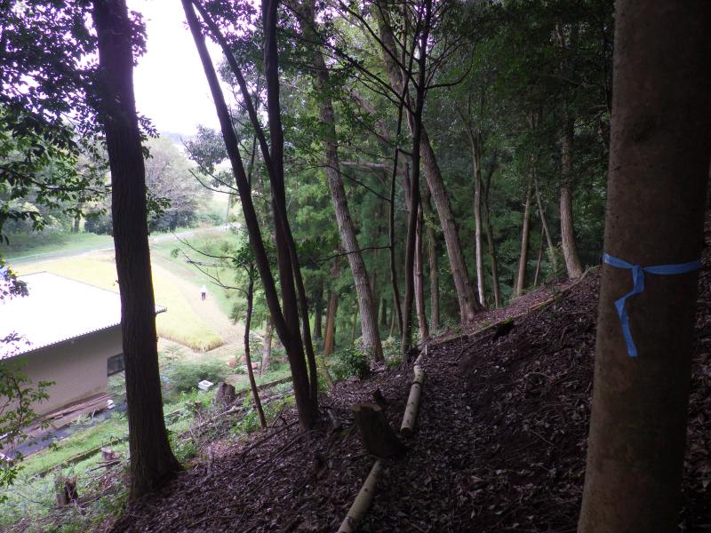 今日は箱岩コースで下山するので展望台手前まで戻り、鞍部から下ります。こちらも白山神社コースと同じ感じの下り坂で箱岩の標識とマーキングは適度にありました。どんどん下っていくと、民家が見え、登山道は堰堤前を横切り、迂回して箱岩の前にでました。