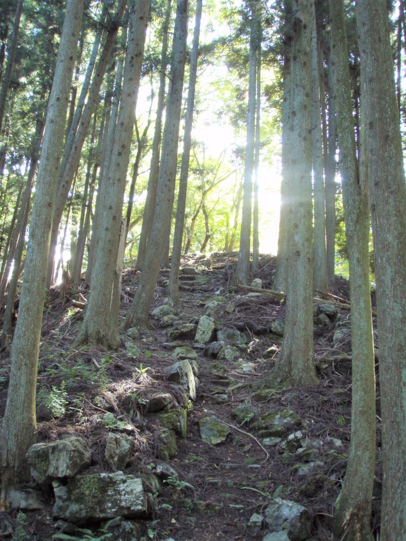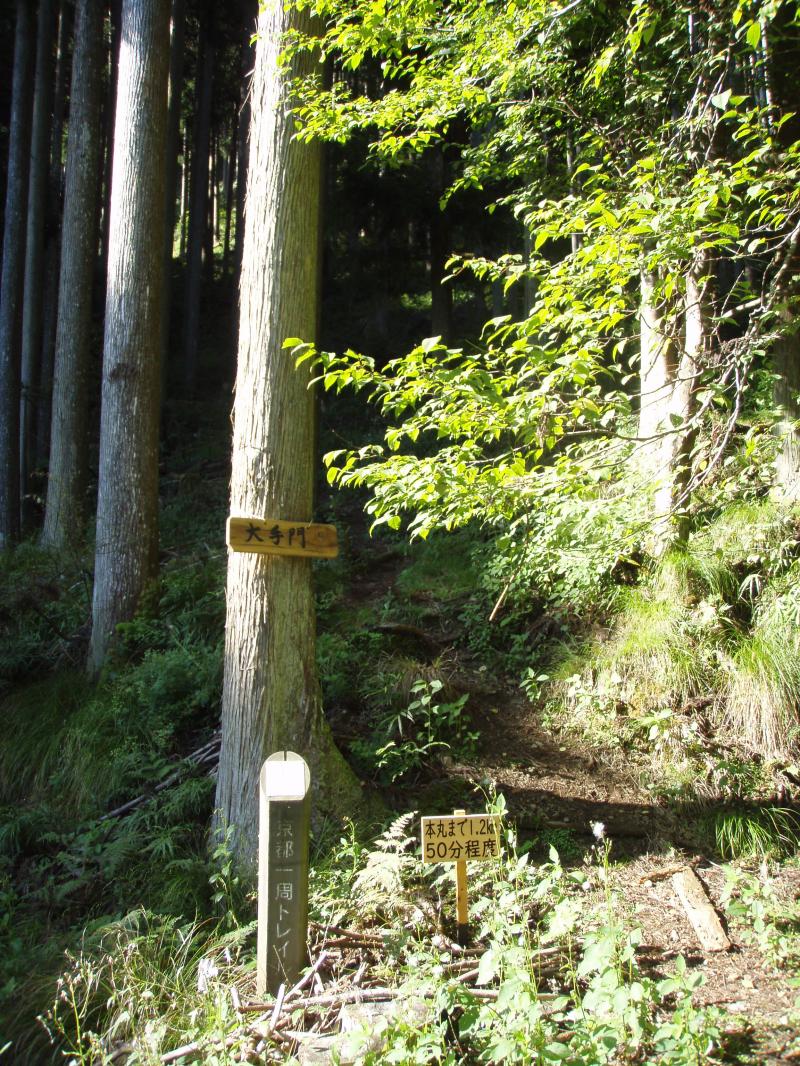 バス停・周山から出発。京都一周トレイルの標識に従い、民家裏にある登山口から、犬に吠えられながら入山。大手門跡から道は細く険しくなりますので、ストックを持参する方が良いです。