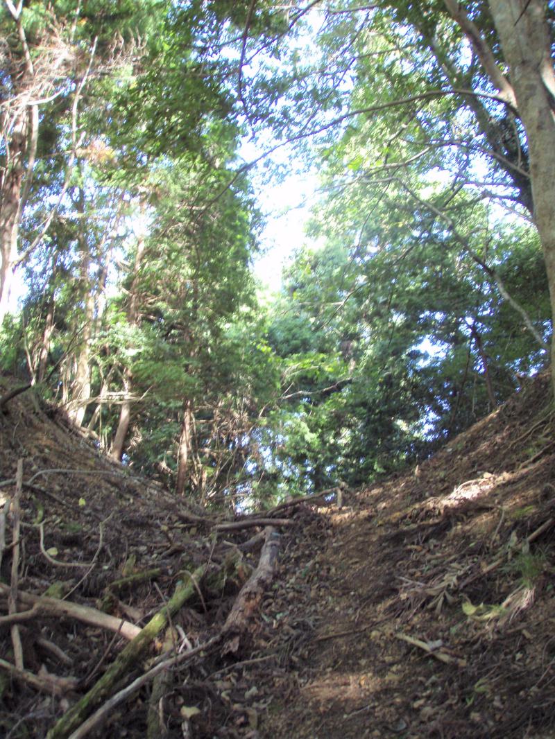 鍛冶屋跡から真っすぐ登って行くと東方面に展望が開けた場所から城山へ。左に向かうと枡形虎口から主郭へ。この辺りから石垣の遺構が出てきます。見所は城山山頂の主郭を越えた先にある天然石を積み上げた壮大な石垣。自然に還りながらも、400年前の姿がそのまま残されています。