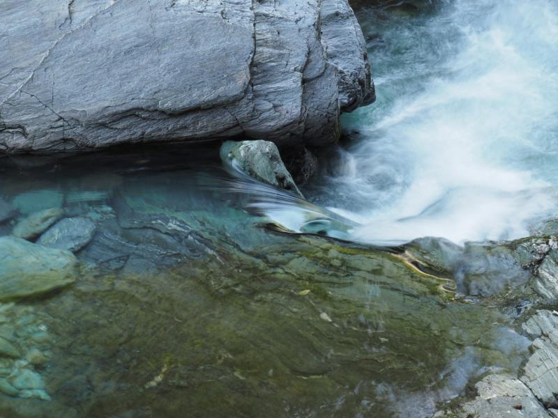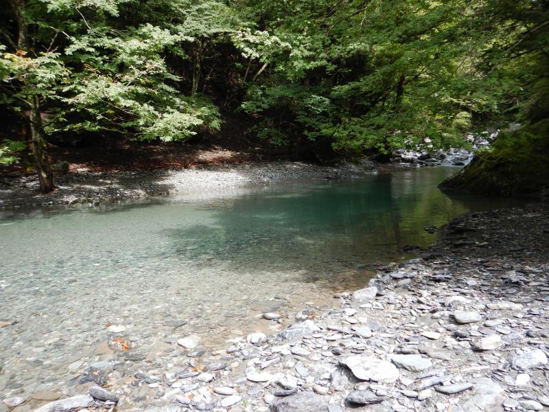 緑泥片岩の緑が透明な流れにはえて、何度も立ち止まって眺めてしまう美しさです。