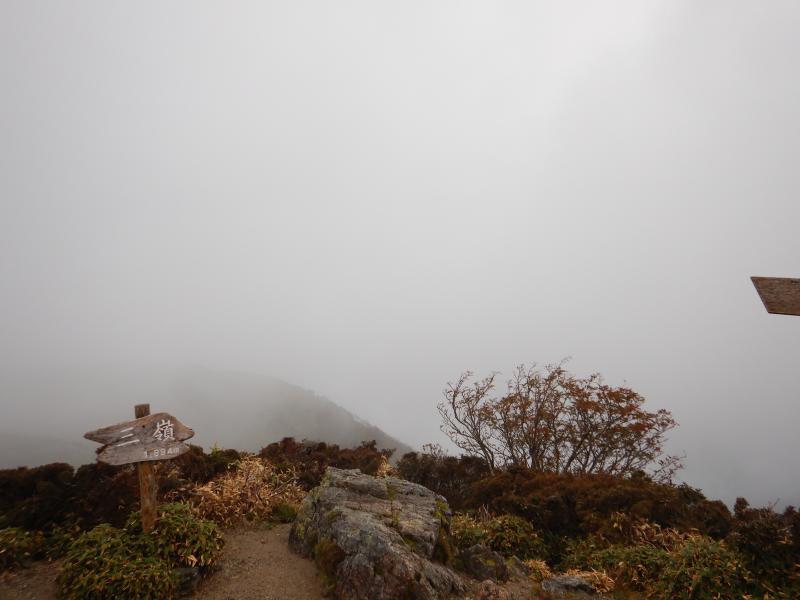 稜線まで上がるころには、カヤハゲから回っていた方が早かっただろうな思うに至りました。雨も降ってきて、三嶺の頂上は真っ白。何も見えません。