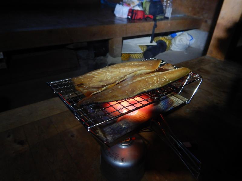 持参したビールで同行の友人と乾杯した後は、白飯を炊き、サバのミリン干しを焼く。