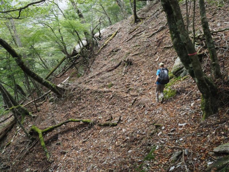 青ガレと呼ばれる場所を過ぎ、沢から斜面を登るようになった辺りででようやく道らしくなりましたが、やはりかなりわかりにくい。