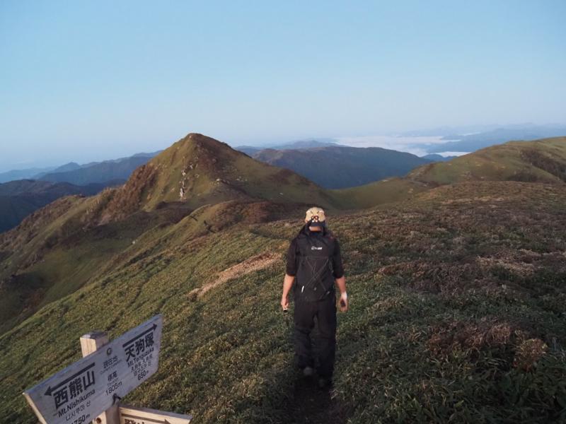 明け方の笹原に浮かぶ天狗塚の姿にしばらく見とれます。