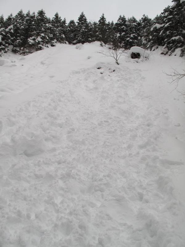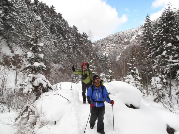 赤岳鉱泉から硫黄岳で向かう樹林帯は、時折風でトレースが消えていたり、軽いラッセルが必要な個所が
