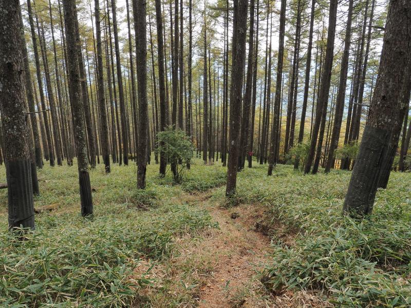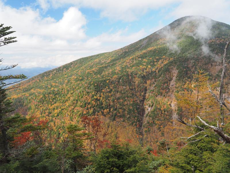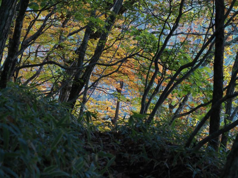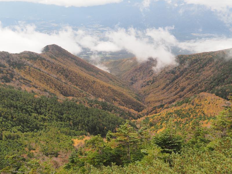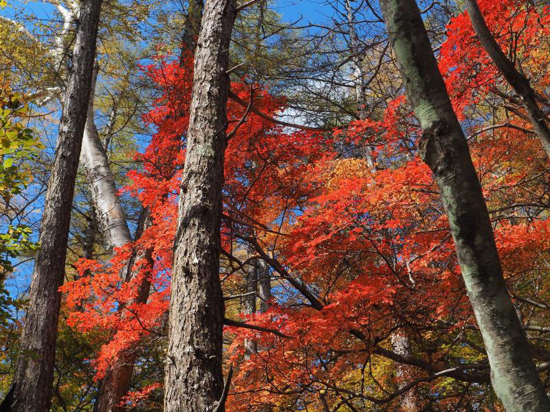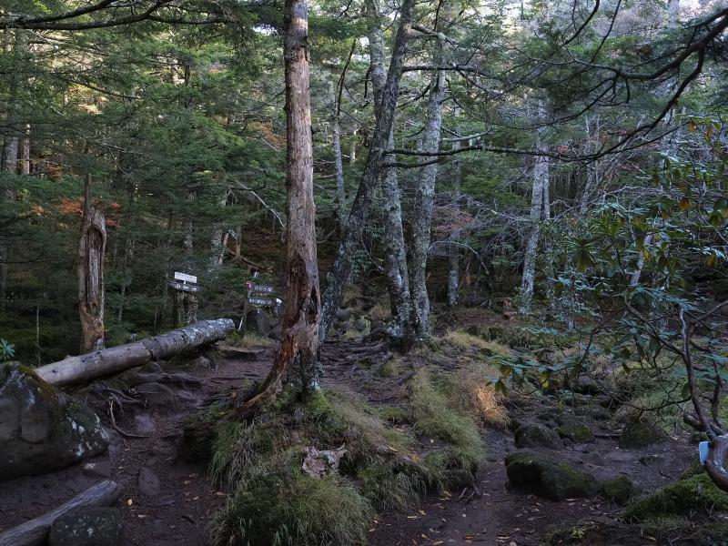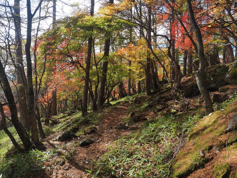 下山します。あとはほぼほぼ下りで、ちょっと楽しみにしていた道。樹林帯の中に入っていきますが、編笠山と権現岳を紅葉の中から見渡せる場所もあります。いくらか下ると急にベンチが出て来て、登山道が砂地になりました。あとはとても歩きやすい道。トレランシューズで駆け降りたらなんと気持ちが良いか…残念ながら今回の靴はトレランシューズではないので。紅葉も赤・黄色と鮮やかです。最後はちょっと登って観音平に到着。