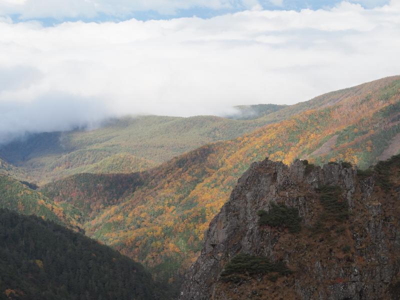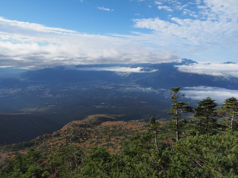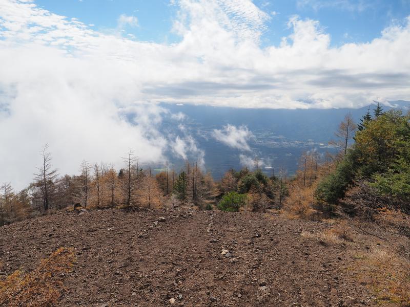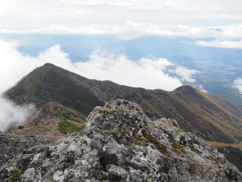 体が温まるまで①+②。そして薄手のグローブ。雲海展望台に着いて体が温まってきて太陽の日差しもありますし、編笠山山頂まではひたすら登りでもあるので①のみに。中腹はなかなか紅葉が綺麗です。だんだん岩と苔が増えてきて、押手川を過ぎると斜度が増してきます。大きな岩で段差もあるので太もも、ふくらはぎを使います。梯子が出て来れば編笠山まではあと少し。振り返ると南アルプスがほんの少し見えています。南にある前線の影響で雲が多くて山はあまり見えませんが西側は青空が出ています。