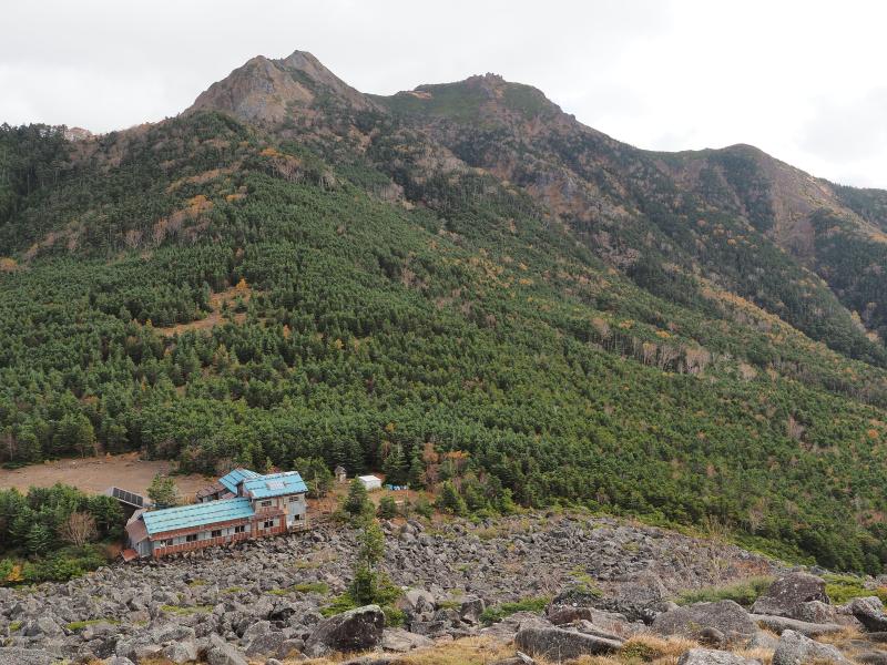2時間かからず編笠山に到着。権現岳、赤岳、阿弥陀岳はなんとか見えてます。編笠山は風でちょっと寒いですね、温度計は一桁台。スマホ操作してたらあっという間に指先が冷えます。寒くてゆっくりしていられないので青年小屋へ。前日の雨で岩が濡れていてちょっと滑りやすい道。ゴロゴロと大きな岩をテンポ良く歩き、遠い飲み屋青年小屋に到着。太陽が暖かい。太陽の日差しがありがたい季節になってきました。