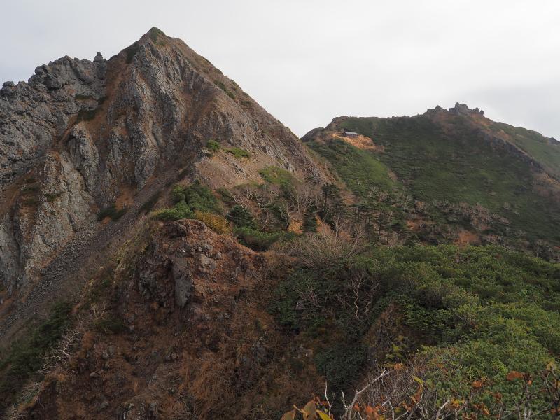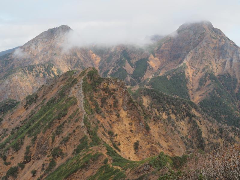 この先権現岳へは森林限界越えなのでまた②を着重ねます。経験上、権現岳付近は編笠山よりも風が弱くなるのでシェルは不要かなぁと。ギボシ付近は岩場で鎖もあるので注意。ギボシをトラバースして稜線に出ると阿弥陀岳と赤岳が目の前に。東の空は雲が多すぎて何も見えませんなぁ…権現岳に登頂して三ツ頭へ。太陽は出たり隠れたりで、日が当たると谷筋の黄葉が綺麗さが増します。三ツ頭付近で昼休憩。固形燃料で湯沸かししてカップ麺とおにぎり。流石に長い時間休憩してると冷えるのでインサレーションベスト持ってきて良かったですね。