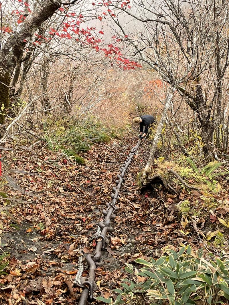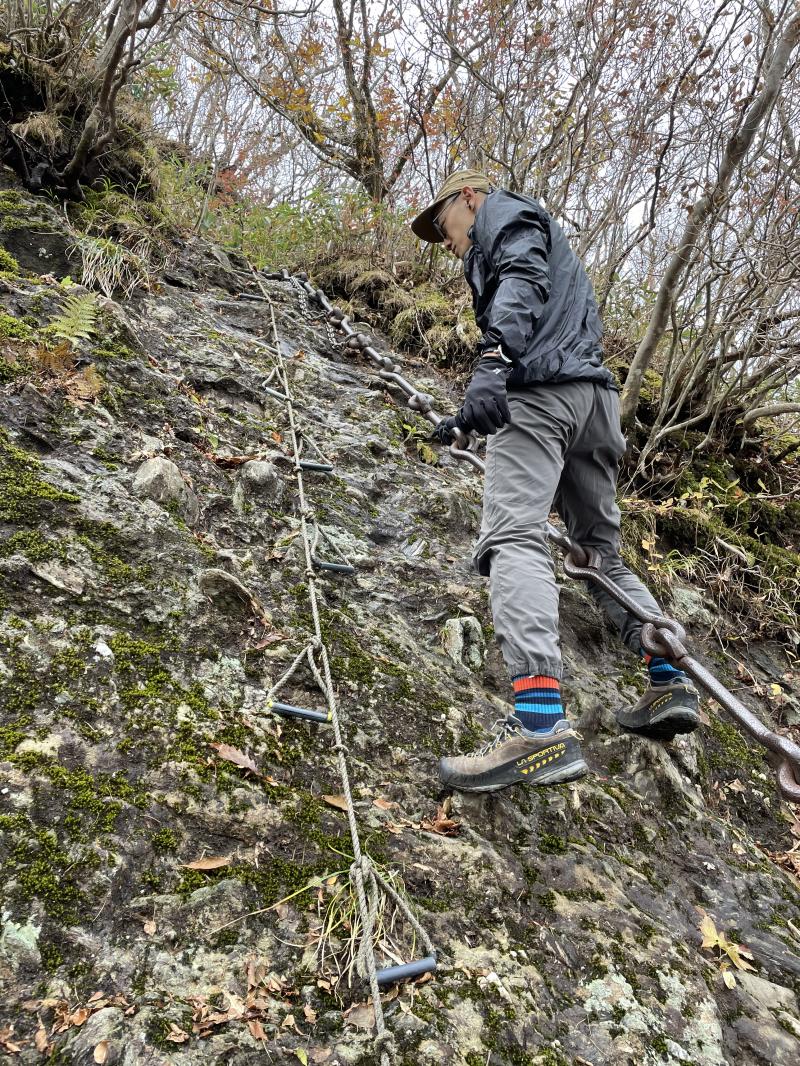 果たして、鎖場では足がかりがほぼなく、濡れていて、かつ外傾した岩にソールを面で押し当てて登っていくという難しさ。