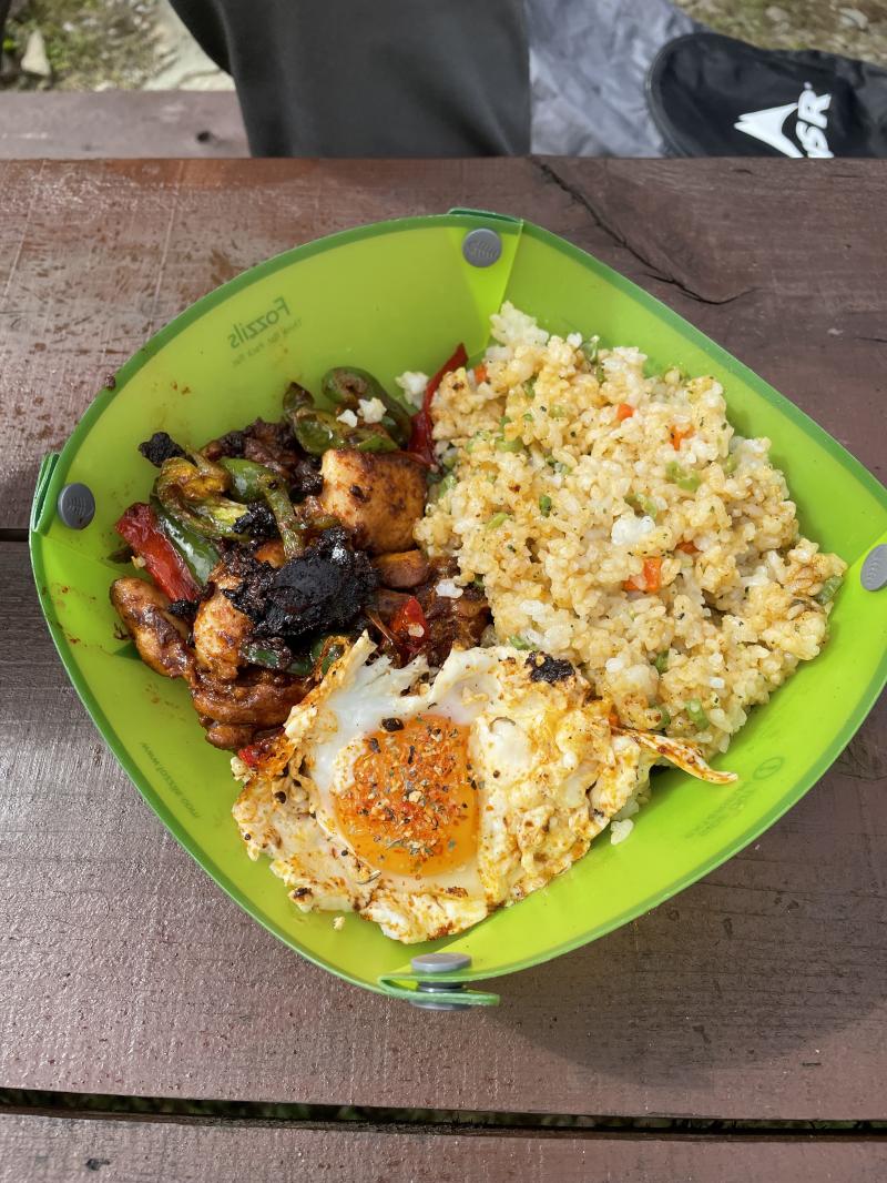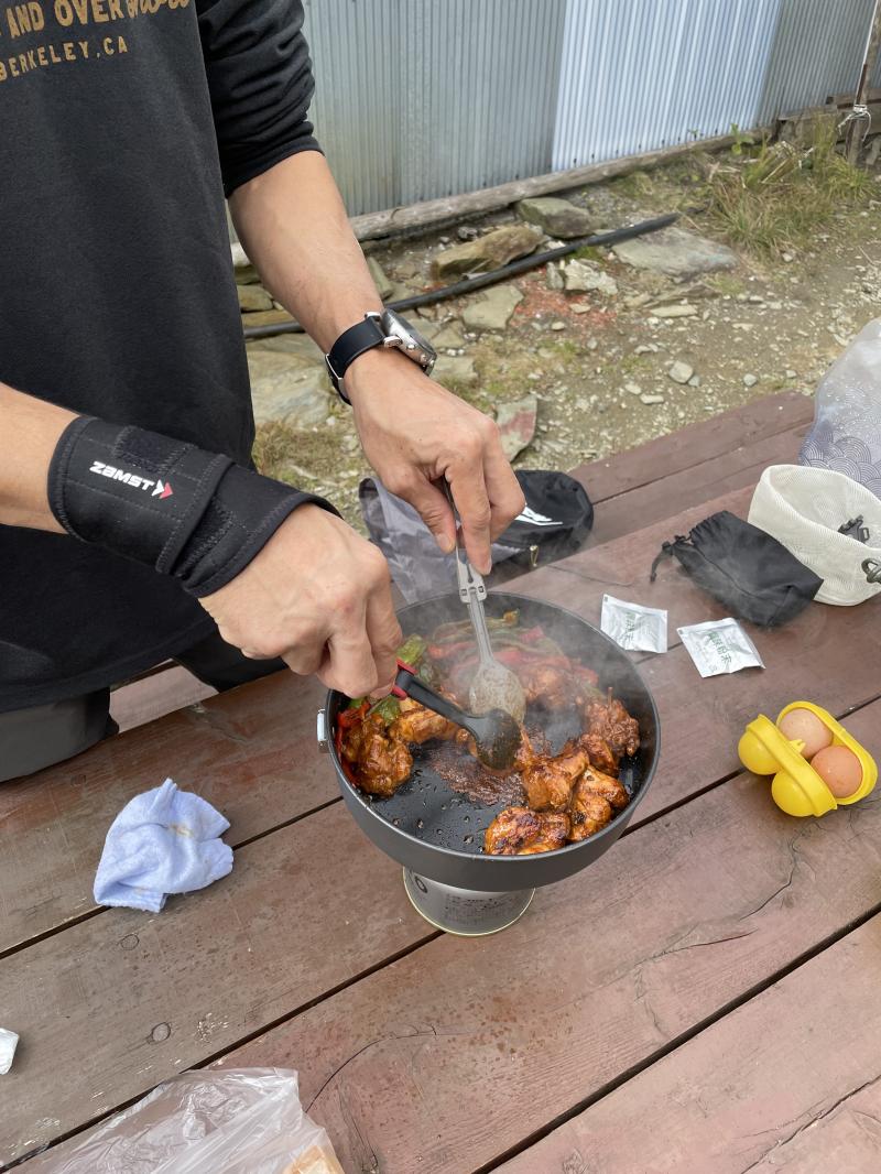 頂上に着くとガスがかかってしまい、お昼ご飯を頂上で食べる予定でしたが、晴れる気配がなかったのでキャンプ場に下りて食べることに。