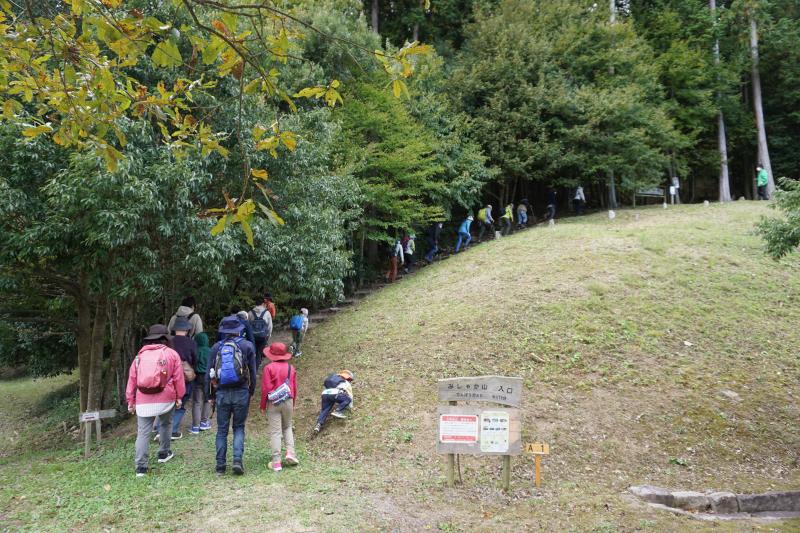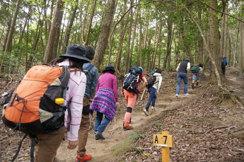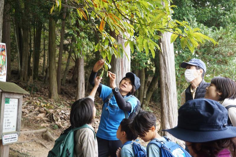 今回は登山ガイドと一緒に歩きます。身近な里山ですが、たくさんの魅力があり、里山林を代表する「コナラ」や「アベマキ」などを探しながら植物の話をしたり、楽な歩き方や野外での安全登山についてなど専門ガイドならではの話も織り交ぜながら歩きました。