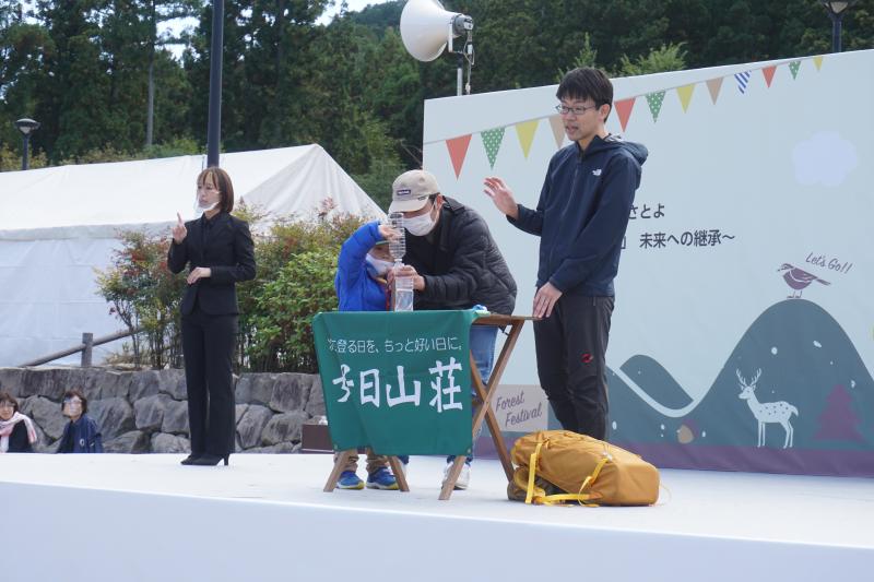 ステージでは聴者の方も巻き込みながら、汚水の浄化、ロープワークやバックパックを使った子供の搬送等を体験頂きました。