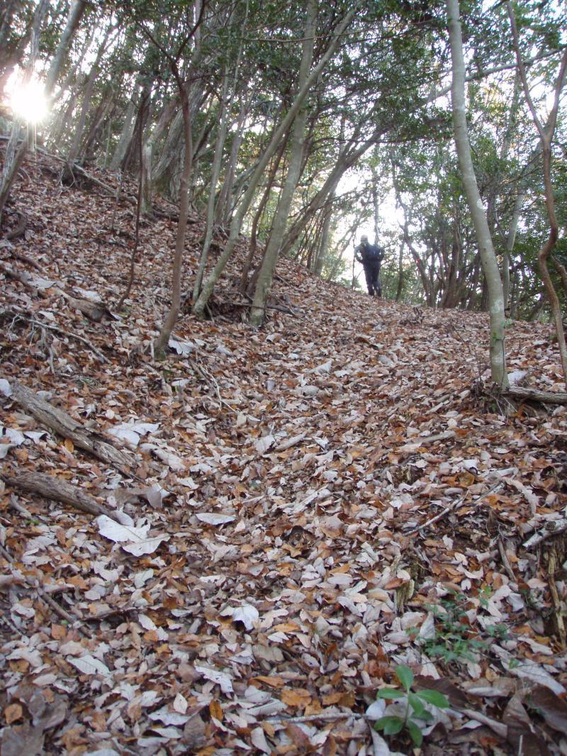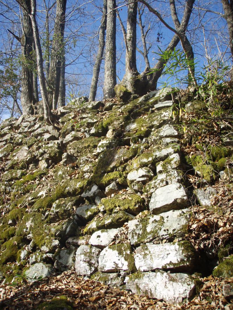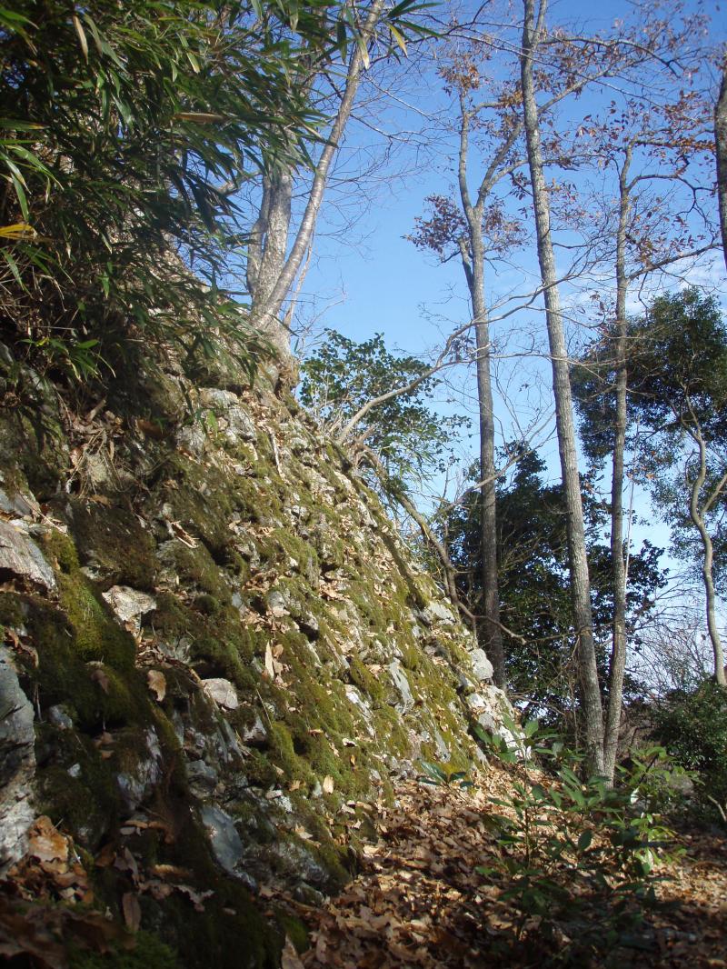 須知城本丸への道は、城に近付くにつれ急勾配になり、最後は地面に触れながら登る感じになります。落ち葉で滑りやすいこの季節は、ストックを持参する方が良いでしょう。城の見所は本丸の裏手の石垣。400年前の石垣がそのまま残されています。